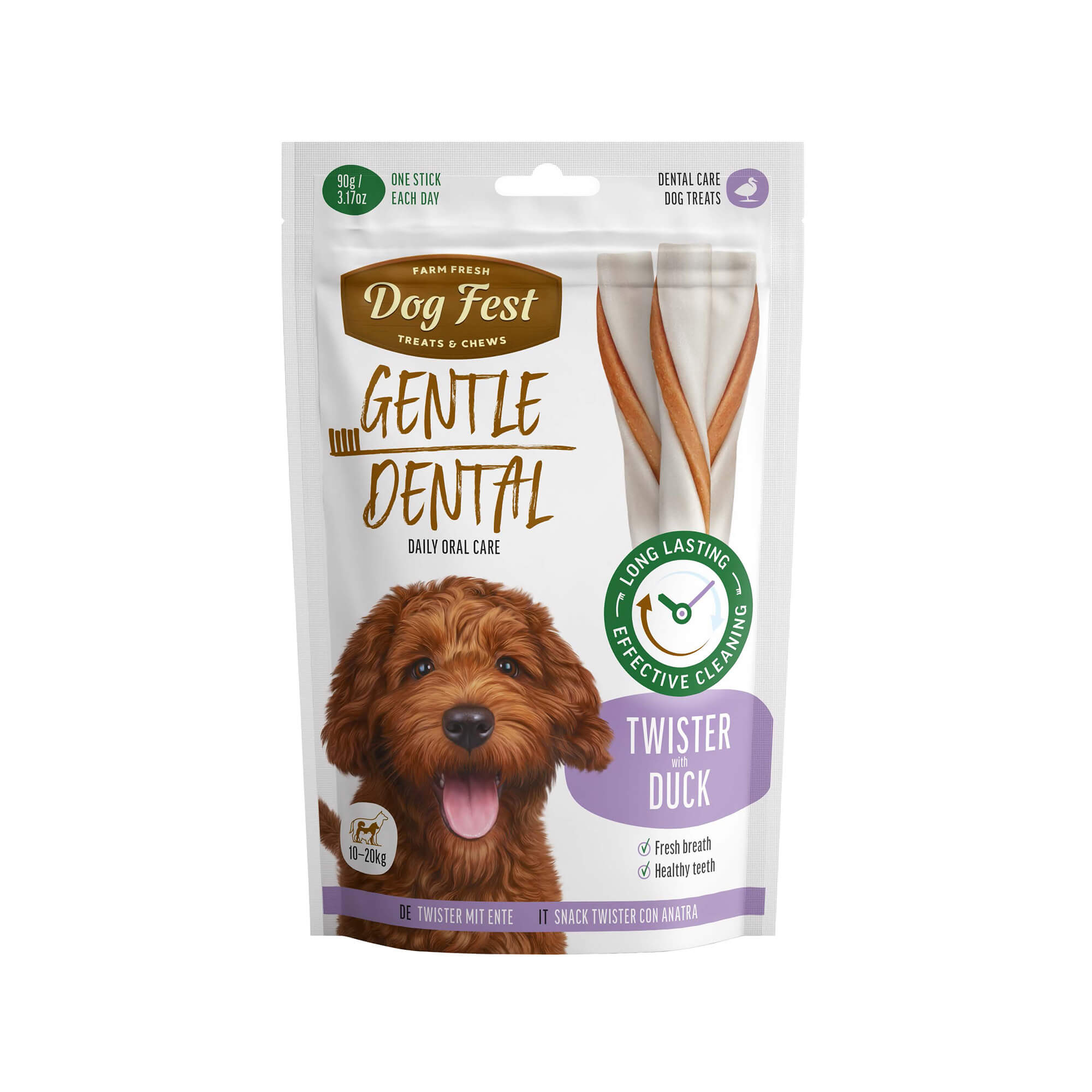 Dog Fest Twister Raca – okusna in funkcionalna zobna poslastica, posebej zasnovana za pse srednje velikosti (10–20 kg). Dental Twister z račjim mesom združuje naravne sestavine in posebno teksturo, ki pomaga očistiti zobe, osvežiti dah in vašemu psu nudi dolgotrajno zabavo.