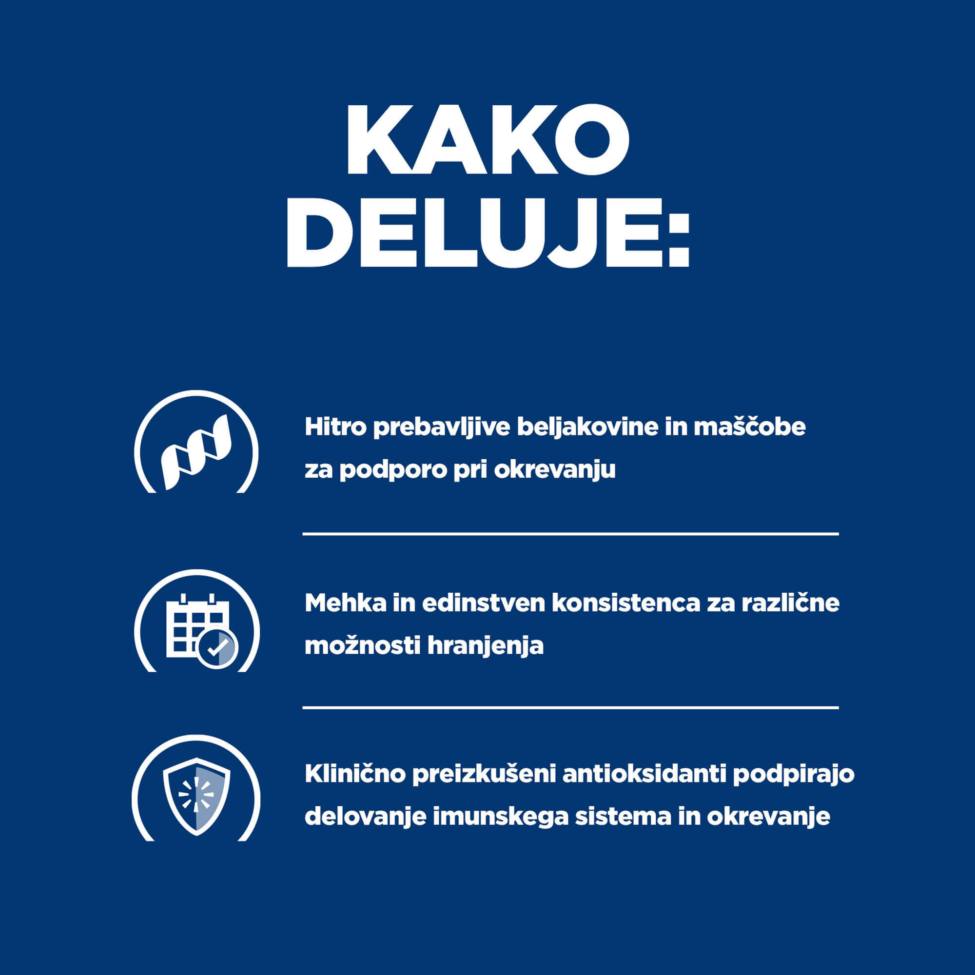 Hill's nutricionisti in veterinarji so razvili prehrano Prescription Diet a/d, klinično preizkušeno prehrano s posebno formulo za pse in mačke, ki okrevajo po operaciji, bolezni ali poškodbi, s katero poskrbite, da boš vaš hišni ljubljenček prejel samo najboljše.