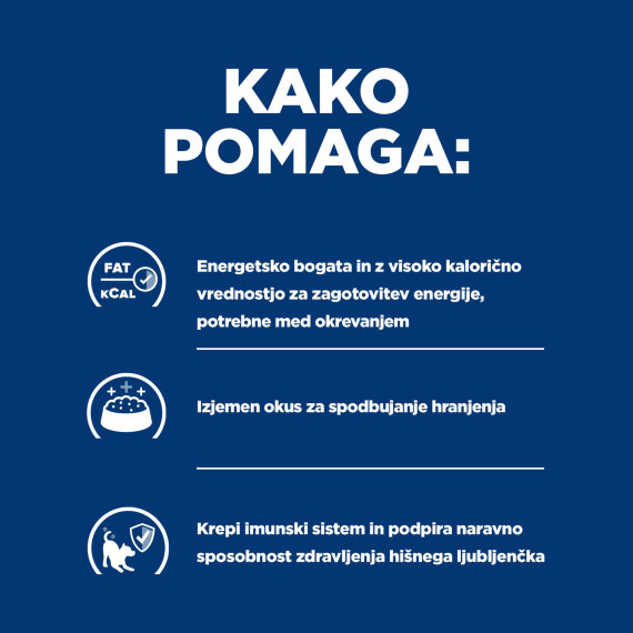 PRESCRIPTION DIET a/d hrana za pse/mačke je namenjena samo občasnemu ali dodatnemu hranjenju. Ni priporočena za dolgotrajno hranjenje (več kot 6 tednov). Za podrobnejše informacije, kako lahko naša hrana Prescription Diet pomaga vašemu hišnemu ljubljenčku uživati v nadaljnjem srečnem in aktivnem življenju, se posvetujte s svojim veterinarjem.