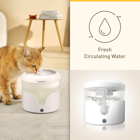 Ohranjajte svoje ljubljenčke hidrirane s Panasonic vodno fontano, zasnovano za mačke ter majhne in srednje velike pse. Ta fontana ima 4-slojni filtracijski sistem, ki zagotavlja svežo, krožečo vodo, filtrira dlake, nečistoče in vonjave, ter odstranjuje kalcij, magnezijeve ione in preostali klor. Njeno skoraj tiho delovanje (25 dB) zagotavlja mirno okolje.