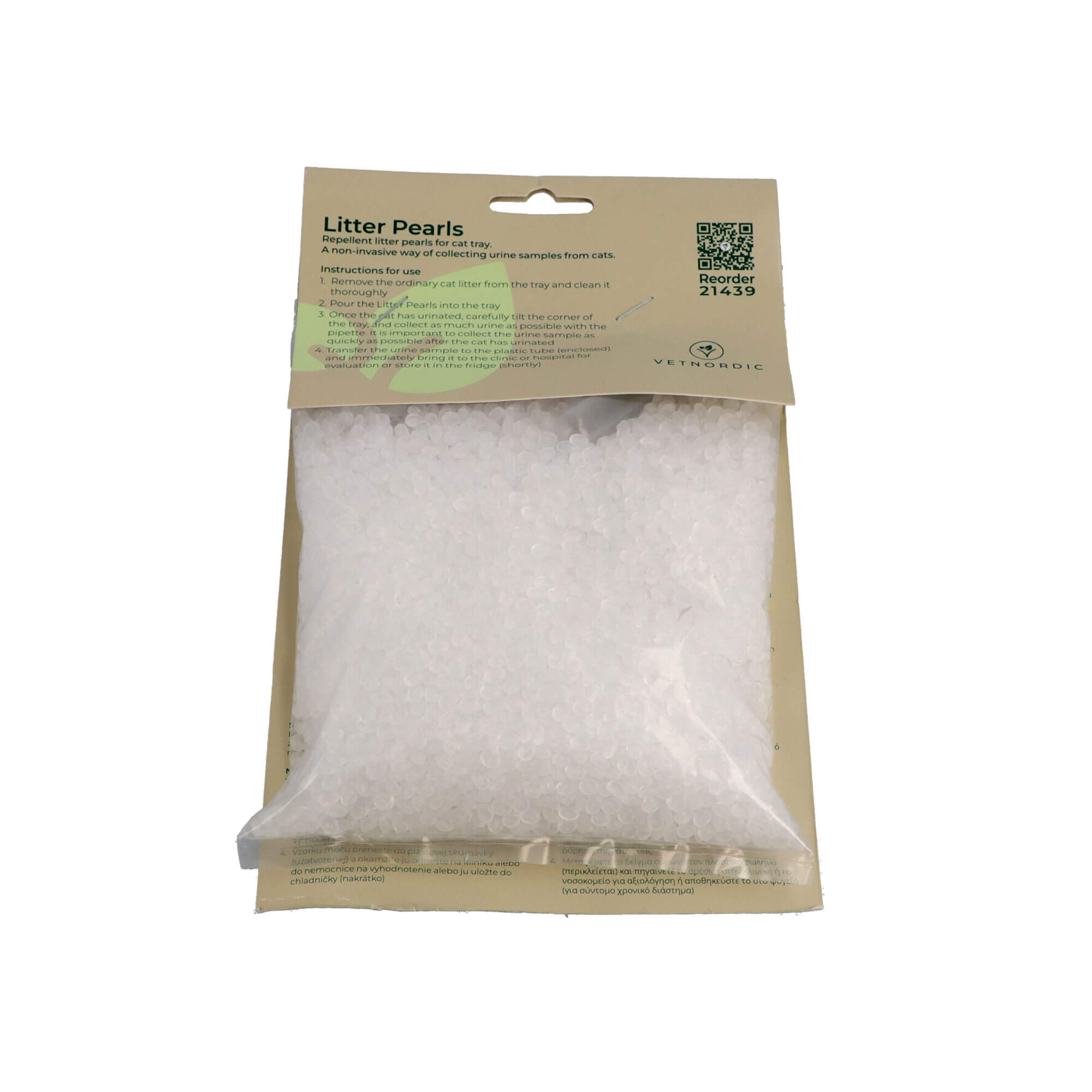 VetNordic Litter Pearls so posebej zasnovane perle za neinvazivno zbiranje vzorcev urina pri mačkah. Te perle ne vpijajo tekočine, kar omogoča enostavno zbiranje urina brez potrebe po invazivnih postopkih.